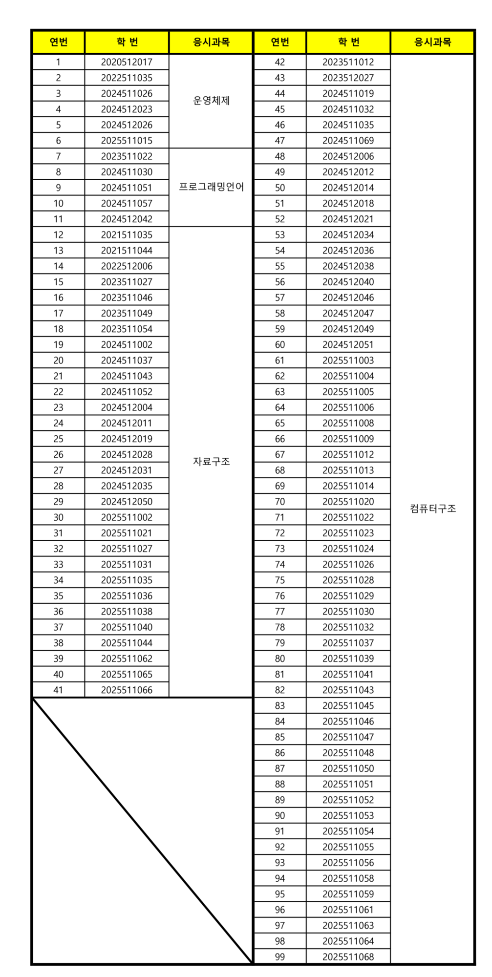 응시 교과목 | 운영체제 프로그래밍언어 자료구조 | 컴퓨터구조 |
